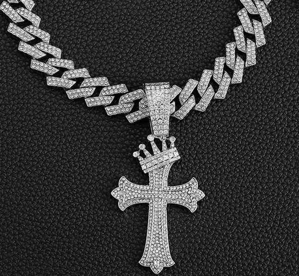 White Gold Iced Out Crown Cross Pendant Hip Hop Alloy Crystal Cross Pendants for Rock Men Charm Jewelry